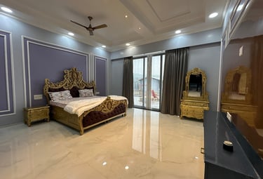 🛏️ 5 Designer Bedrooms with plush bedding, wardrobe, and AC